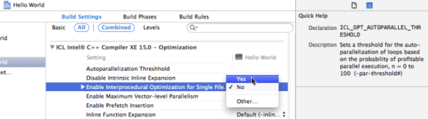 Select a Setting, such as Enable Interprocedural Optimization for Single File Compilation, and set the option's state. If the Quick Help inspector is visible, information about the selected option appears under Quick Help.
